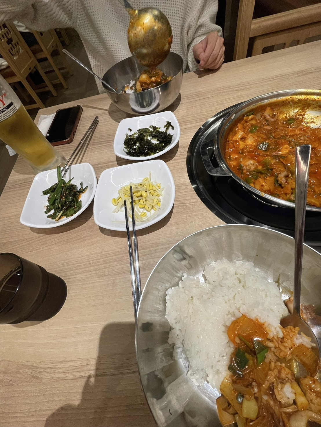 タコ、エビ、ホルモンなどを辛いタレで煮込んだ釜山の郷土料理です